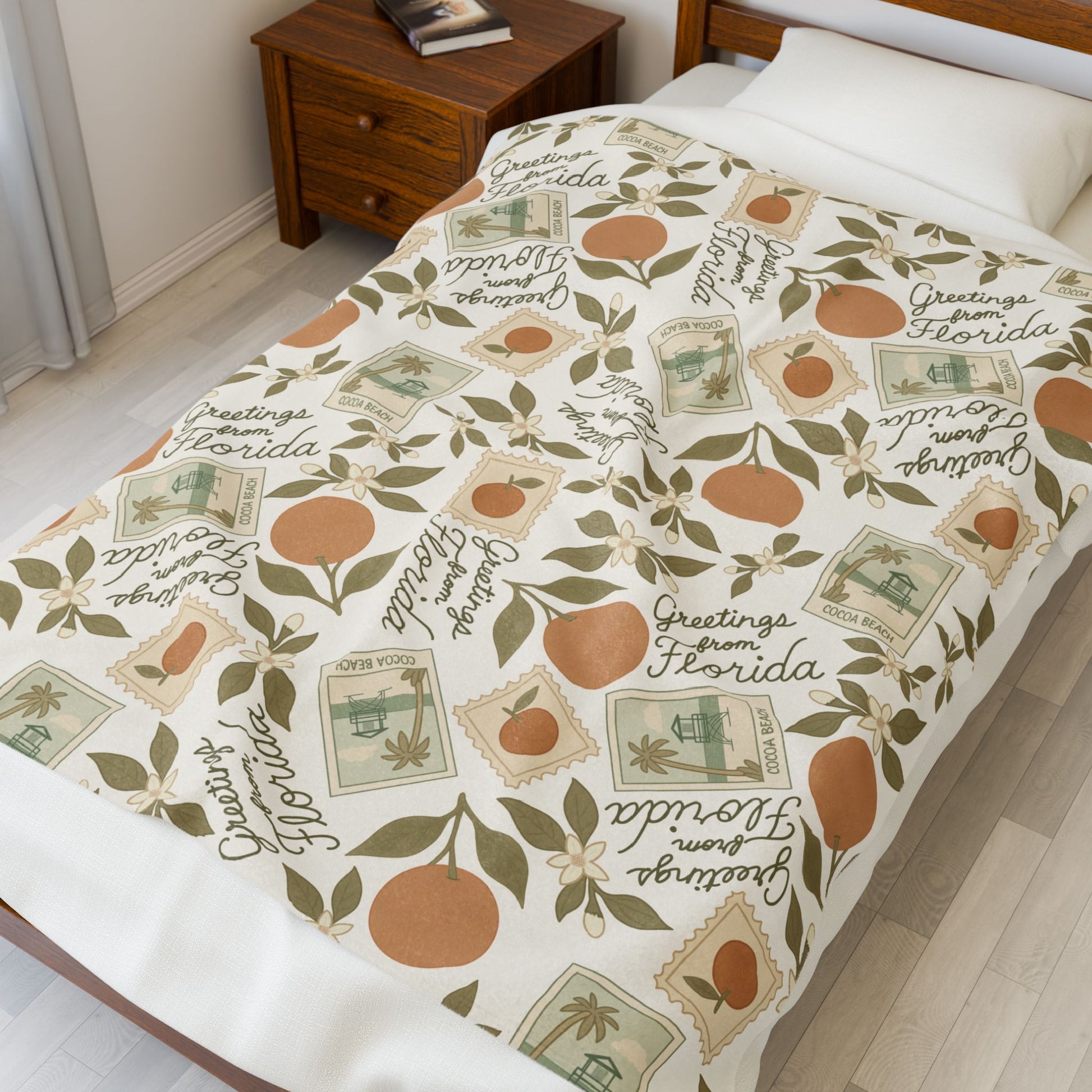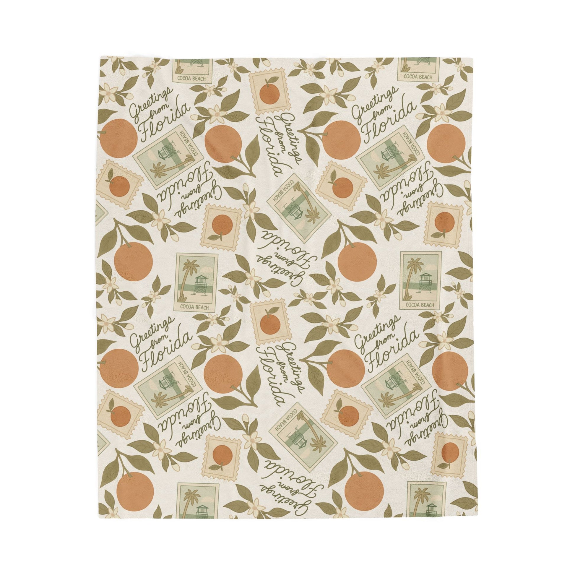 Transport yourself to sunny days gone by with this charming velveteen plush blanket inspired by vintage Florida postcards. Featuring nostalgic Cocoa Beach imagery, vibrant oranges, and delicate orange blossom details, it captures the golden era of coastal getaways. Luxuriously soft and perfect for snuggling, this retro-inspired throw brings warmth, wanderlust, and a splash of citrus-scented nostalgia to your home.